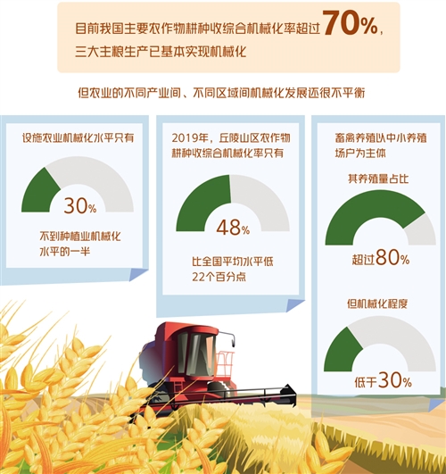 农业农村部副部长张桃林说,我国丘陵山区主要分布在19个省份1400多个县市。长期以来,由于自然条件限制,许多地方机耕道路缺乏,加之农艺栽培模式复杂、适用机具不多,严重制约了机械化发展。2019年,丘陵山区农作物耕种收综合机械化率只有48%,比全国平均水平低22个百分点。面对这一短板,丘陵地区开展农田“宜机化”改造建设,让原来的“巴掌田”“鸡窝地”变成了农机纵横的舞台。