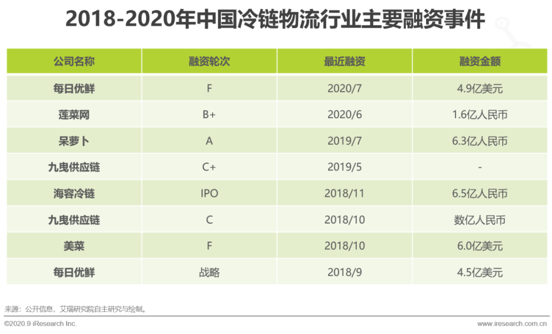 产业中上下游整合,融资收购事件频起:由于冷链物流网前期投资较大,经资本培育,帮助企业提高投入,加快技术进步,建设冷链网络,有效提升资源配置效率,降低物流成本。通过产业中下游并购重组及一系列融资事件为冷链物流行业带来更多资本注入及资源拓展,培育更多如聚盟、九曳等一众成熟冷链物流企业,帮助行业加速增长。