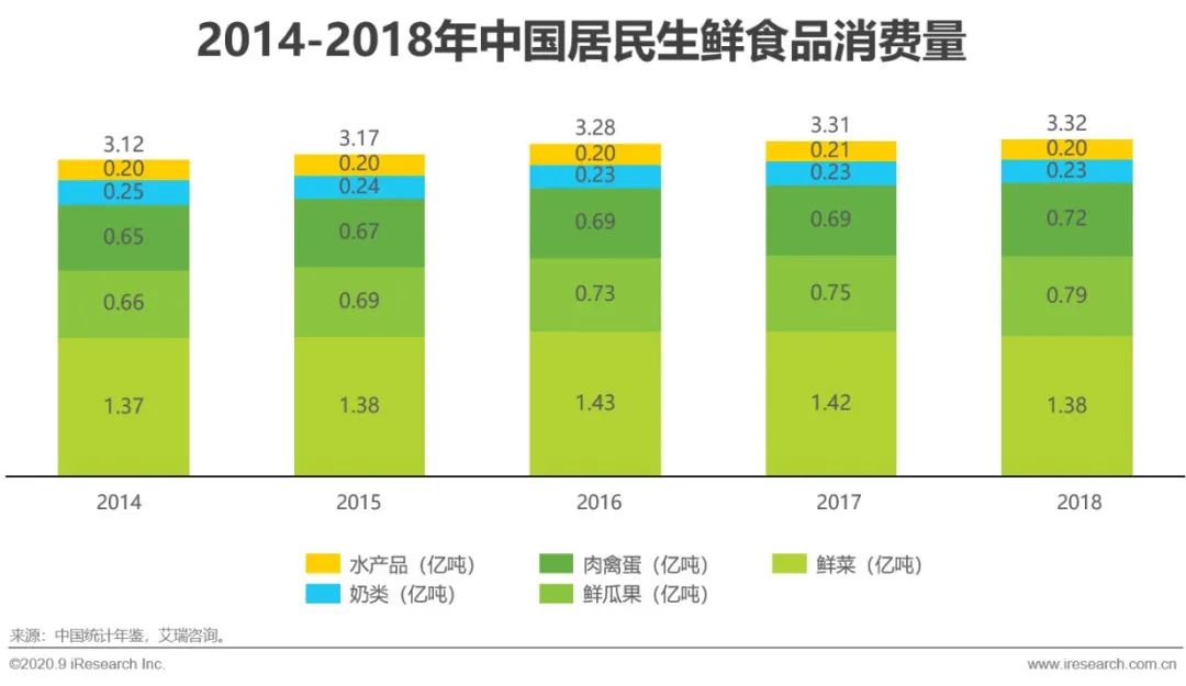 中国统计年鉴数据显示,全国居民消费的生鲜食品总量由2014年的3.1亿吨增长至2018年的3.3亿吨,年复合增长率为1.6%。