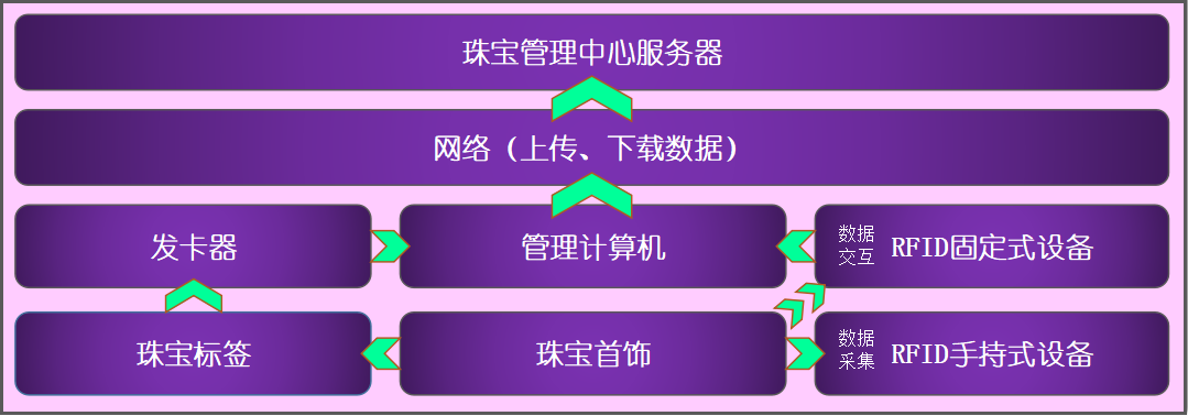 RFID智慧珠宝管理系统的建设,将RFID技术贯穿于珠宝管理从入库到完成销售的各个环节。企业可以根据自身业务特点,在关键节点部署RFID系统。