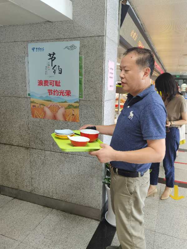 电信职工食堂里张贴了倡导“光盘行动”的标识。