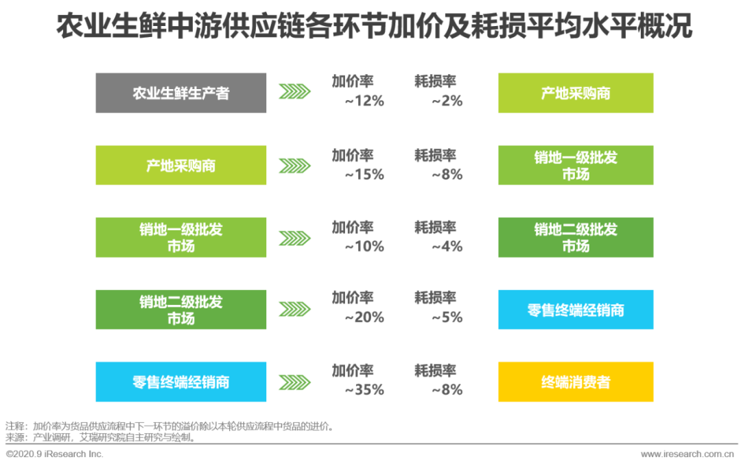 而销地批发市场通常交易规模较大,能够辐射省级地理区域。各级批发市场的规模悬殊使得各环节的流通速率、储存条件大相径庭,而繁琐的链条削弱了从业者的盈利能力,限制了从业者改善前述经营条件的能力。同时,由于生产者与消费终端相隔多层分销环节,生产者通过提升品质、建设品牌从而建立终端竞争力的能力也受到大幅限制。